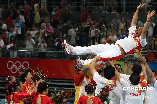 掛上金牌的“六朵小花”與教練們,高興地將中國體操管理中心主任高健拋向空中慶祝。中新社發(fā) 任晨鳴 攝