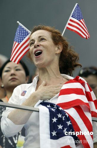 8月13日,一名美國觀眾和美國游泳隊一起高唱國歌慶祝勝利。當日,美國隊在北京奧運會男子4x200米自由泳接力項目上,奪得金牌并刷新世界紀錄,美國運動員在“水立方”屢獲佳績,也成為美國觀眾最幸福的地方。中新社發(fā) 杜洋 攝