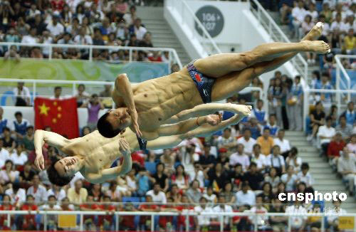 8月13日下午,北京奧運會男子雙人三米跳板決賽,中國組合秦凱/王峰技壓群雄,奪得冠軍,為中國奧運軍團摘取第16塊金牌。中新社發(fā) 杜洋 攝