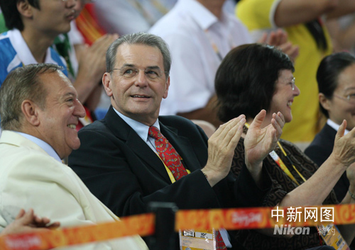 國際奧委會主席羅格在場下為打破世界紀錄的劉春紅精彩的表現(xiàn)鼓掌。中新社記者 武仲林 攝