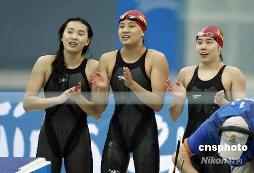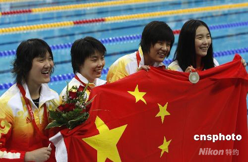 8月14日11時,北京奧運會女子4x200米自由泳接力決賽在國家游泳中心水立方舉行,由朱穎文、徐妍瑋、楊雨、龐佳穎組成的中國隊,以7分45秒93的成績戰(zhàn)勝美國隊,為中國泳團再添一枚銀牌。澳大利亞女隊以7分44秒31打破世界紀錄獲得金牌。美國隊獲得第三,成績是7分46秒33。 中新社發(fā) 杜洋 攝