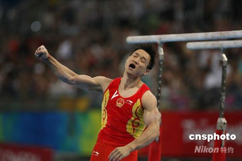 8月14日,中國奧運“三朝元老”楊威在北京奧運會體操男子個人全能決賽中力壓群雄,以94.575分,高出亞軍2.6分的較大優(yōu)勢,奪得這塊體操個人項目中分量最重的金牌,他也成為繼李小雙之后中國體操的第二位個人全能奧運冠軍。中新社發(fā) 武仲林 攝