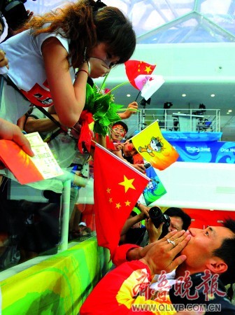 此時(shí),看臺(tái)上的王丹已經(jīng)哭得像個(gè)淚人,王峰溫柔地為妻子抹去臉上的淚水。這一刻,“水立方”浪漫滿屋。看著仍然忍不住掉淚的愛人,王峰雙手獻(xiàn)上“飛吻”,然后向新聞發(fā)布廳走去。