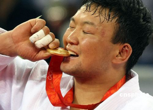 8月14日晚,蒙古男子柔道選手奈丹在北京奧運(yùn)會(huì)男子柔道100公斤級(jí)決賽中獲得冠軍,這是蒙古國(guó)選手獲得的有史以來(lái)第一枚奧運(yùn)會(huì)金牌。中新社發(fā) 任晨鳴 攝