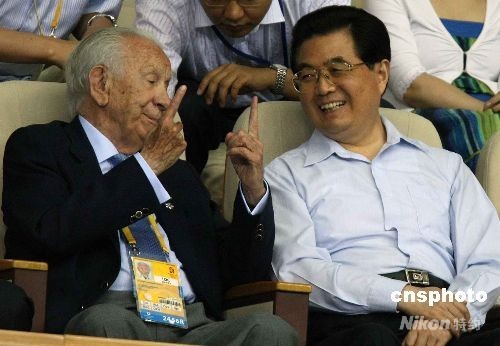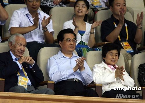 8月15日晚,胡錦濤夫婦與國(guó)際奧委會(huì)終身名譽(yù)主席薩馬蘭奇等到北京首都體育館,觀看北京奧運(yùn)會(huì)中國(guó)與美國(guó)女排比賽。中新社發(fā) 任晨鳴 攝