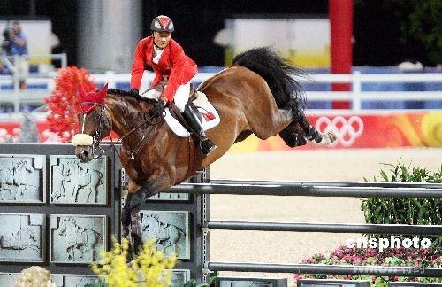 八月十五日晚,在香港沙田主場館進(jìn)行的奧運(yùn)馬術(shù)場地障礙個人賽上,中國選手李振強(qiáng)策馬飛躍障礙。當(dāng)日,中國馬術(shù)代表隊四名選手首度亮相,參加場地障礙賽個人賽第一輪資格賽。中新社發(fā) 洪少葵 攝