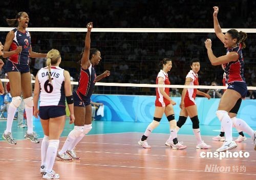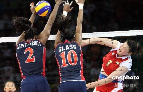 8月15日晚,北京奧運(yùn)會(huì)女排小組賽中國(guó)與美國(guó)之戰(zhàn)在北京奧運(yùn)會(huì)排球比賽館--首都體育館舉行,這場(chǎng)被戲稱為“和平大戰(zhàn)”的比賽最后時(shí)刻,兩名美國(guó)選手封死了中國(guó)隊(duì)王一梅的扣殺而以3比2戰(zhàn)勝中國(guó)女排。中新社發(fā) 任晨鳴 攝