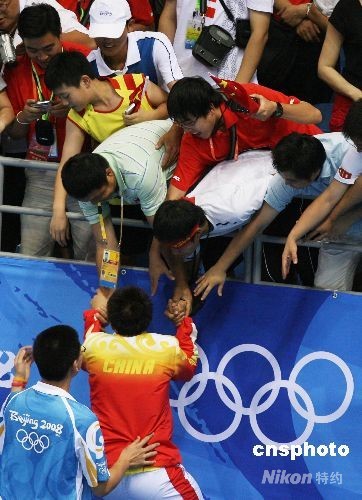 8月15日晚,中國(guó)組合杜婧、于洋在北京奧運(yùn)會(huì)羽毛球女子雙打決賽中以2比0戰(zhàn)勝韓國(guó)組合李孝貞、李敬元,奪得金牌。圖為杜婧、于洋與觀眾互動(dòng)。中新社發(fā) 武仲林 攝