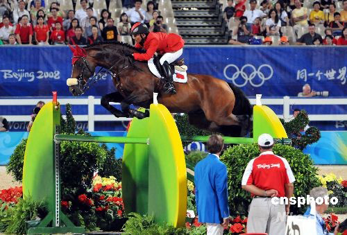 圖:中國(guó)選手李振強(qiáng)在奧運(yùn)馬術(shù)場(chǎng)地障礙賽登場(chǎng)