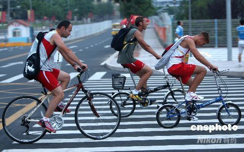 北京2008奧運(yùn)會(huì)青島分賽場(chǎng)的奧帆村居住著來(lái)自世界各地的400多名運(yùn)動(dòng)員,許多運(yùn)動(dòng)員在比賽之前選擇自行車運(yùn)動(dòng)為賽前的準(zhǔn)備活動(dòng),“自行車比賽”場(chǎng)景經(jīng)?梢(jiàn)。中新社發(fā) 趙振清 攝