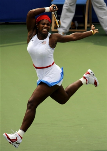 大威擊球的動(dòng)作就像在“扭秧歌”,造型頗似奧運(yùn)會(huì)徽“舞動(dòng)的北京”。