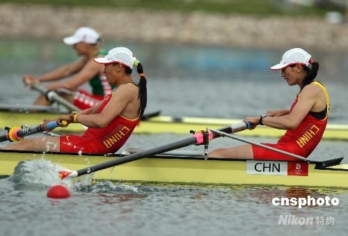 8月16日,中國選手吳優(yōu)、高玉蘭在北京奧運會賽艇女子雙人單槳決賽中奪得銀牌。中新社發(fā) 武仲林 攝