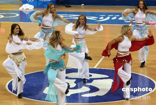北京奧運會男子籃球小組賽第四輪比賽8月16日在五棵松籃球館舉行,“北京夢幻之舞”拉拉隊的烏克蘭姑娘為觀眾表演新學(xué)的“中國功夫”。中新社發(fā) 任晨鳴 攝