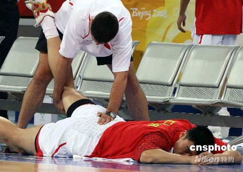 8月16日,北京奧運(yùn)會(huì)男子籃球小組賽第四輪比賽在五棵松籃球館舉行,為了爭奪小組出線權(quán)而躋身八強(qiáng)之列,由姚明率領(lǐng)的中國隊(duì)與由諾維斯基、卡曼率領(lǐng)的德國隊(duì)展開“生死大戰(zhàn)”之前兩小時(shí),中國隊(duì)就到達(dá)賽場(chǎng),姚明在場(chǎng)地內(nèi)一邊“偷窺”德國隊(duì)的訓(xùn)練,一邊接受火箭隊(duì)隊(duì)醫(yī)的專門治療。中新社發(fā) 任晨鳴 攝