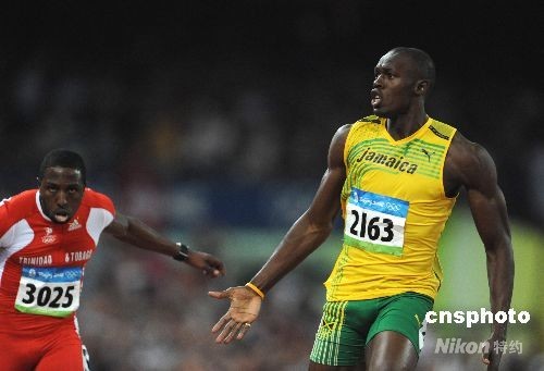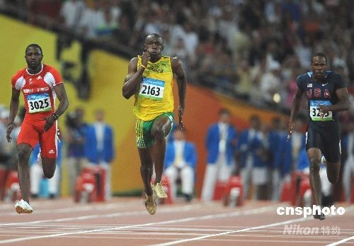 8月16日晚,牙買加選手尤塞恩·博爾特在中國(guó)國(guó)家體育場(chǎng)“鳥巢”進(jìn)行的北京2008年第二十九屆奧運(yùn)會(huì)男子100米決賽中,以9秒69的成績(jī)奪得金牌并打破9秒72的世界紀(jì)錄。中新社發(fā) 古玉 攝