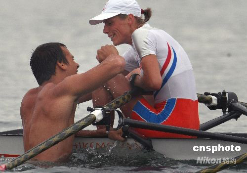 8月17日下午,荷蘭選手基爾斯滕·范德科爾卡在北京奧運會賽艇女子輕量級雙人雙槳決賽中獲得冠軍后,男友奮身躍入水中狂游200米送上熱吻。 中新社發(fā) 任晨鳴 攝