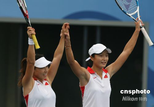 8月17日,中國選手鄭潔、晏紫在北京奧運會網(wǎng)球女子雙打比賽中戰(zhàn)勝烏克蘭組合,奪得銅牌。 中新社發(fā) 武仲林 攝