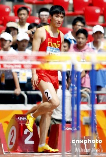 8月18日上午,在北京奧運男子110米欄第1輪第6組比賽中,中國選手劉翔因腿傷遺憾退出比賽。中新社發(fā) 盛佳鵬 攝