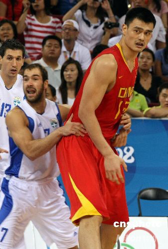 北京奧運會男子籃球小組賽第五輪比賽8月18日在五棵松籃球館舉行,由姚明統(tǒng)率的中國隊與世界勁旅希臘隊為八強位置展開激戰(zhàn),最終,實力不足的中國隊以77比91告負;昔日與姚明在NBA火箭隊搭檔的斯潘諾理斯指揮球隊嚴密防守姚明,并砍下全場最高的19分。中新社發(fā) 任晨鳴 攝