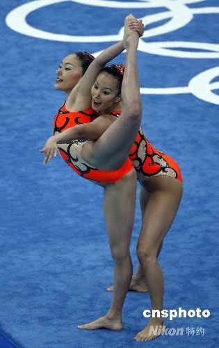 8月18日,北京奧運會花樣游泳比賽在“水立方”拉開帷幕,在首場比賽雙人技術自選項目中,日本選手原田早穗、鈴木繪美子以48.250的總分排名第三位。中新社發(fā) 杜洋 攝