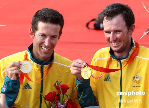8月18日,北京2008奧運(yùn)帆船比賽在青島分賽場舉行,澳大利亞隊(duì)內(nèi)森·威爾莫特和馬爾科姆·佩奇組合獲得雙人艇男子470級冠軍。 中新社發(fā) 趙振清 攝