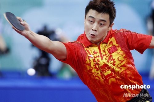 8月18日,北京奧運會乒乓球男子團(tuán)體決賽在北京大學(xué)體育館舉行,王皓將為中國隊打頭陣,戰(zhàn)勝德國隊的新秀奧恰洛夫,為中國隊拿下第一分。中新社發(fā) 盛佳鵬 攝