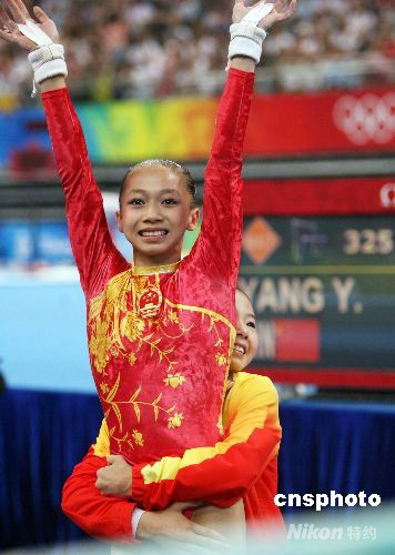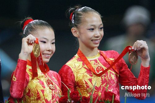 8月18日,中國選手何可欣(左)在北京奧運會女子高低杠決賽中16.725分的成績奪得金牌,隊友楊伊琳獲得銅牌。 中新社發(fā) 武仲林 攝