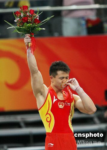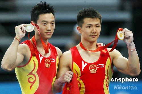 8月18日,中國(guó)選手陳一冰(右)在北京奧運(yùn)會(huì)男子吊環(huán)決賽中以16.6分的成績(jī)奪得金牌,另一位中國(guó)選手楊威獲得銀牌。 中新社發(fā) 武仲林 攝