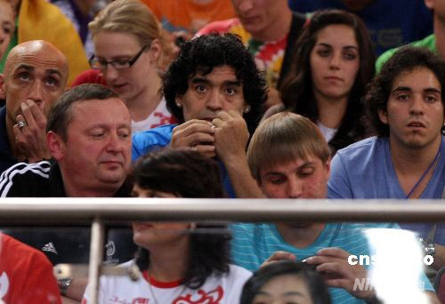 8月18日晚,“球王”馬拉多納駕臨北京五棵松籃球館,觀看北京奧運會男籃阿根廷隊與俄羅斯隊之戰(zhàn)。中新社發(fā) 任晨鳴 攝