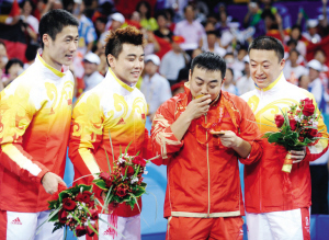 當(dāng)三位隊(duì)員戴上沉甸甸的金牌,王勵(lì)勤向臺(tái)下的人指了指,王皓、馬琳也急忙揮手,不一會(huì)劉國(guó)梁終于走上了頒獎(jiǎng)臺(tái),只見(jiàn)王皓與馬琳一左一右摟著劉國(guó)梁,然后隊(duì)員們紛紛摘下自己的金牌套在他的脖子上,中國(guó)男團(tuán)的眾志成城、團(tuán)結(jié)一心叫人印象深刻,他們所做的一切為的就是完成國(guó)人對(duì)于國(guó)球不變的期望。