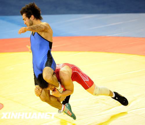8月19日,在北京奧運(yùn)會(huì)摔跤男子自由式60公斤級(jí)1/8決賽中,前南馬其頓選手穆拉德·拉馬扎諾夫(藍(lán))戰(zhàn)勝韓國(guó)選手金鐘大。新華社記者李鋼攝