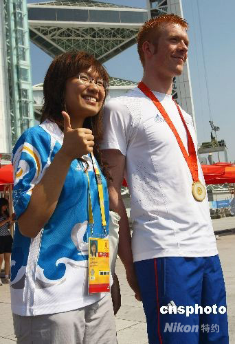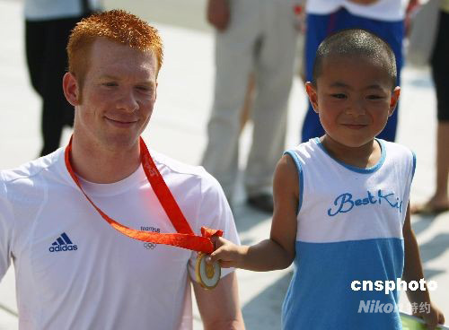 8月19日,獲得北京奧運會自行車團體追逐賽冠軍的英國自行車運動員在奧林匹克公園內(nèi)接受媒體采訪,大批觀眾、游客和志愿者紛紛上前與其合影。而英國自行車運動員也依然沉浸在獲得金牌的喜悅中,做起了“模特”。 中新社發(fā) 劉新 攝