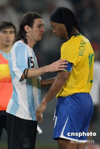 8月19日晚,北京奧運(yùn)會(huì)男足第二場(chǎng)半決賽在北京工人體育場(chǎng)舉行,由球星梅西領(lǐng)銜的阿根廷隊(duì)以3比0淘汰巴西隊(duì)進(jìn)入決賽。賽后,梅西與巴西隊(duì)隊(duì)長(zhǎng)羅納爾迪尼奧擁抱并安慰這位好友。 中新社發(fā) 任晨鳴 攝