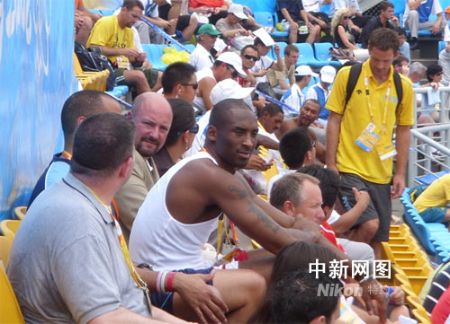科比觀看比賽很投入。對于精彩的回合也不吝掌聲。后來可能是感覺有些熱,他脫掉了紅色T恤,穿著白色背心繼續(xù)觀賽。