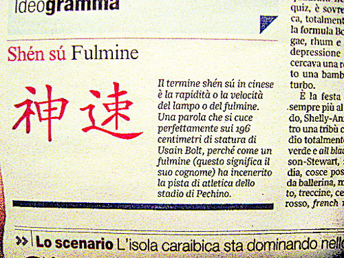 這個“漢字”專欄自北京奧運會開幕之日起,每天一期、每期一詞,每個詞都標(biāo)注拼音,引出一段新聞。如8月8日的專欄詞匯是“鳥巢”,在這兩個漢字下面用意大利語解釋了“鳥巢”在漢語中的本意,介紹了北京的國家體育場,并配上焰火照耀下的“鳥巢”夜景圖片。其后的專欄相繼刊登了“文身”、“興奮劑”、“球門”、“地區(qū)”、“神速”等漢語詞匯。在漢字“興奮劑”下報道的新聞是:奧組委為實現(xiàn)“干凈的奧運會”已向興奮劑宣戰(zhàn),北京設(shè)立了由220名高級專家組成的超級檢測中心,每天檢測數(shù)量達250例。“神速”一詞解讀的新聞是:這個在漢語中意為閃電般快速的詞,恰如其分地描繪了飛人博爾特17日晚破百米紀錄的情景。這名身高196cm的運動員,以其閃電般的速度征服了北京國家體育場內(nèi)的所有觀眾。(記者穆方順)