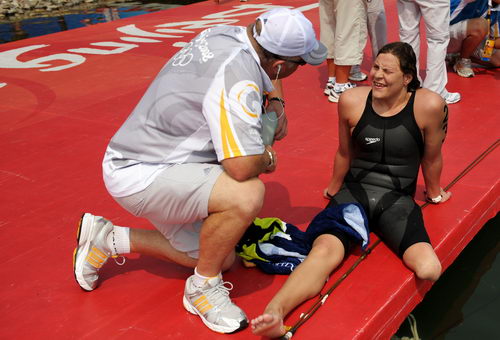 納塔莉·杜托伊特(右)在賽后上岸。新華社記者劉大偉攝