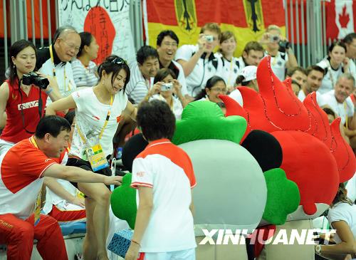 8月19日,中國選手郭晶晶在觀看比賽前和福娃合影。當(dāng)日,北京奧運會跳水比賽在國家游泳中心——“水立方”繼續(xù)進行,何沖在男子3米跳板決賽中獲得冠軍。 新華社記者趙鵬攝