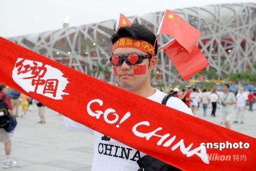 圖為北京年輕小伙打出“紅動(dòng)中國(guó)”拉拉隊(duì)橫幅。