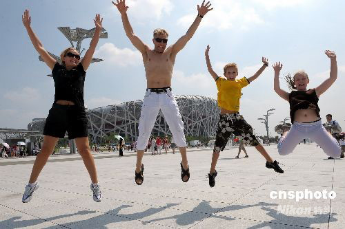圖為外國(guó)游客一家人“鳥(niǎo)巢”外激情飛躍。