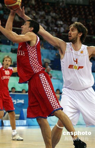 8月20日,北京奧運(yùn)會(huì)男子籃球八進(jìn)四淘汰賽在五棵松籃球館開(kāi)戰(zhàn),2006年世錦賽冠軍西班牙隊(duì)在球星保羅·加索爾的率領(lǐng)下,以72比59戰(zhàn)勝歐洲勁旅克羅地亞隊(duì)。保羅·加索爾(白)上場(chǎng)26分鐘,砍下全場(chǎng)最高的20分。中新社發(fā) 任晨鳴 攝
