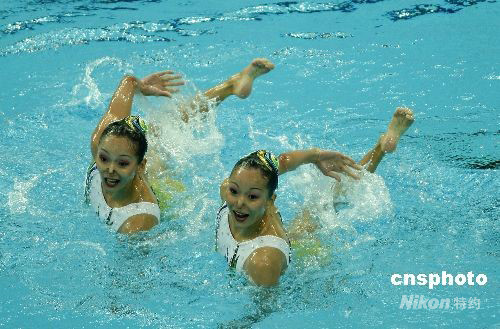 8月20日,在北京奧運(yùn)會花樣游泳雙人自由自選決賽中, 中國花樣游泳“姐妹花”蔣婷婷、蔣文文排名第四,無緣獎牌。金牌被俄羅斯組合摘得。中新社發(fā) 杜洋 攝
