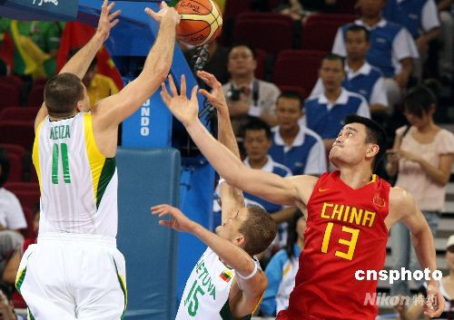 北京奧運會男子籃球四分之一淘汰賽8月20日在五棵松籃球館開戰(zhàn),中國隊在與歐洲勁旅立陶宛隊的拼殺中終因?qū)嵙Σ粷?8比94告負,無緣北京奧運會四強,立陶宛隊進入奧運會男籃四強。超級中鋒姚明上場33分鐘,砍下全隊最高的19分。 中新社發(fā) 任晨鳴 攝