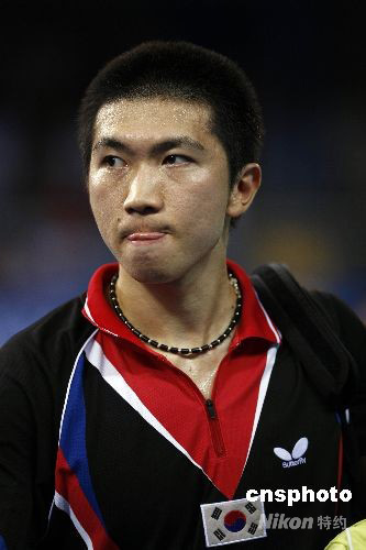 8月21日,北京奧運會乒乓球男子單打第三輪的比賽在北京大學體育館進行,中國香港選手高禮澤4比2戰(zhàn)勝韓國名將柳承敏晉級下一輪比賽。中新社發(fā) 盛佳鵬 攝