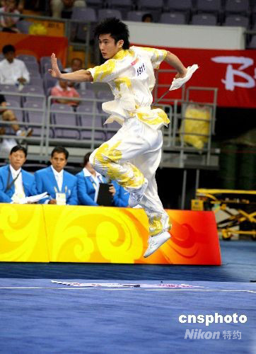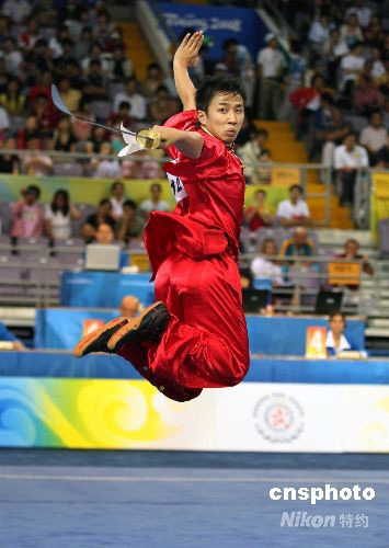 中國(guó)澳門(mén)參賽隊(duì)員賈瑞在武術(shù)套路男子刀術(shù)賽中奮力拼搏。