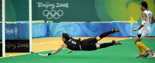 8月21日,在北京奧運(yùn)會(huì)男子曲棍球賽場上,新西蘭隊(duì)迎戰(zhàn)巴基斯坦,最終新西蘭隊(duì)以4:2獲勝。圖為新西蘭一名隊(duì)員飛身擊球。