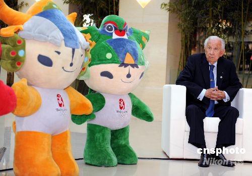 8月21日,國際奧委會終身名譽主席薩馬蘭奇攜手福娃在北京奧林匹克公園展示中心參加活動。中新社發(fā) 王東明 攝