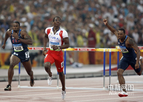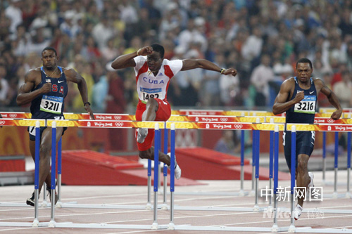 8月21日,北京奧運會男子110米欄決賽在“鳥巢”舉行,最終古巴選手羅伯斯以12.93秒的成績獲得金牌。 中新社記者 盛佳鵬 攝