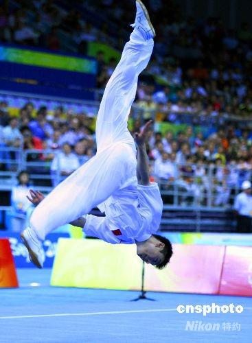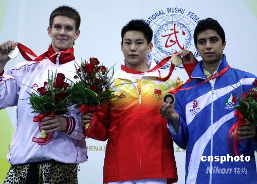 8月22日上午,中國運動員袁曉超在北京2008武術比賽男子長拳賽中奪得金牌,俄羅斯、伊朗選手分別獲得銀牌和銅牌。中新社發(fā) 宋吉河 攝