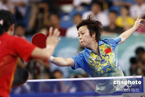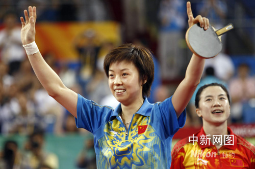 8月22日晚,在北京大學(xué)體育館進(jìn)行的北京奧運(yùn)會乒乓球女子單打決賽中,中國乒乓球名將張怡寧以4-1戰(zhàn)勝自己的隊(duì)友王楠,為中國代表團(tuán)贏得本屆奧運(yùn)會第47枚金牌。中新社發(fā) 盛佳鵬 攝