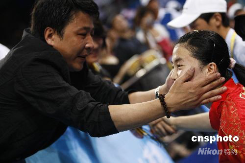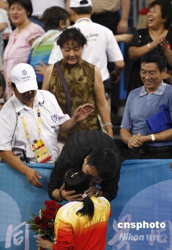 8月22日晚,在北京大學(xué)體育館進(jìn)行的北京奧運(yùn)會乒乓球女子單打決賽,中國乒乓球老將王楠抱憾負(fù)于隊友張怡寧獲得銀牌,在現(xiàn)場觀戰(zhàn)的王楠老公郭斌賽后撫慰愛妻。 中新社發(fā) 盛佳鵬 攝